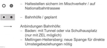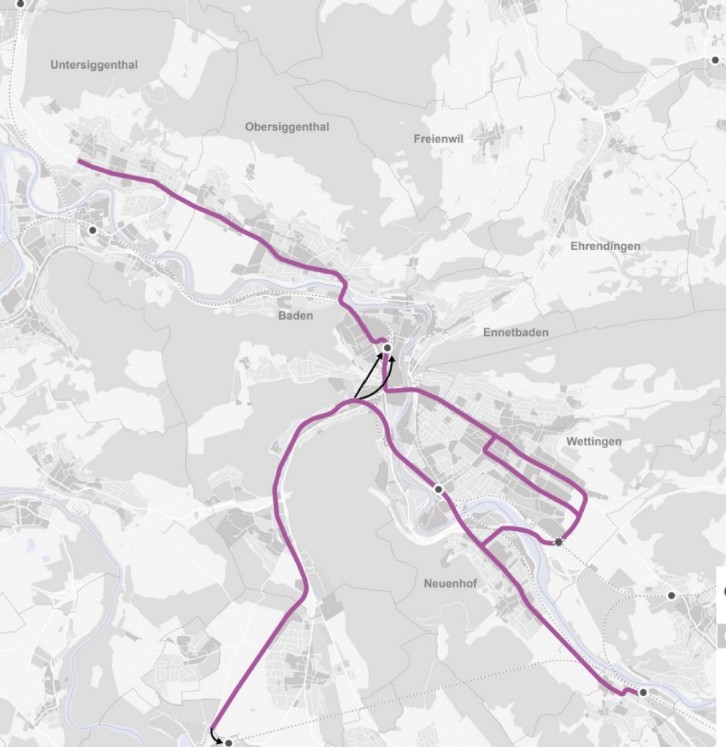 Dass parallel zu den möglichen Tramachsen mit einer Ausnahme (Burghaldetunnel) schon heute durchgehend separat trassierte Bahnlinien bestehen, wird weder im Massnahmen- noch im sog. Faktenblatt erwähnt, geschweige denn diskutiert – ein Prachtbeispiel von Röhrenblick. Die im Faktenblatt erwähnten Entwicklungsschwerpunkte Wettingen Ost und Dättwil lassen sich bei Notwendigkeit mit einer Haltestelle Tägerhard und der Wiedereinführung des Personenverkehrs auf der Nationalbahnlinie (inkl. Burghaldetunnel) sehr gut abdecken.